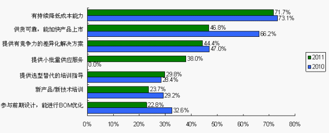 此外,工程師對成本降低持續(xù)關(guān)注,小批量供應服務成為工程師關(guān)注的亮點。隨著市場的企穩(wěn),供貨可靠不再變成重大事件。2011中國電子制造商采購行為調(diào)查發(fā)現(xiàn),工程師對供貨穩(wěn)定可靠的期望由2010調(diào)查的66.2%大幅降至2011調(diào)查的46.8%。