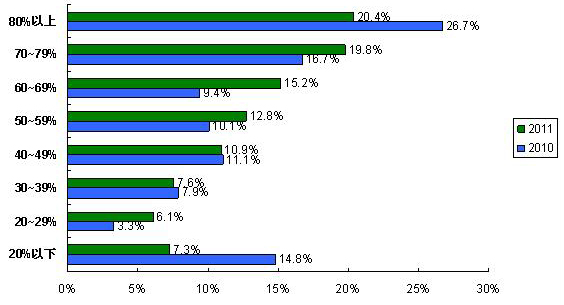 2011調(diào)查中國外品牌元器件占采購總額比例平均為58.6%,比2010調(diào)查的57.1%上升1.5%。采購國外品牌元器件占采購總額比例為70-79%、60-69%、50-59%三個區(qū)段的系統(tǒng)廠商占47.8%,是采購的主體,研發(fā)活動活躍,這三個部分呈現(xiàn)出對國外品牌元器件需求的快速增長。而采購國外品牌比例在80%以上和20%以下是采購的兩極,這兩極通過平衡采購比例來分散采購風險,因此,這兩極的系統(tǒng)廠商數(shù)量比2010調(diào)查有顯著降低。雖然2010年的元器件缺貨給國產(chǎn)元器件進入AVL(合格供應商,Approved Vendor List)帶來機會,但是該趨勢還未對電子元器件供應鏈整體產(chǎn)生顯著影響。