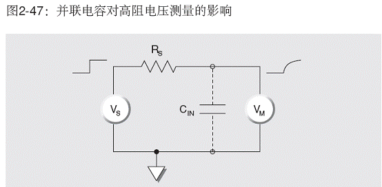 在對高阻抗源進行電壓測量時(圖2-47),電壓表(VM)兩端的電容(CIN)必須通過RS充電。輸出電壓對時間的函數(shù)關系為: