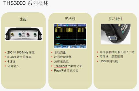 圖1:適用于實(shí)驗(yàn)室和現(xiàn)場環(huán)境的電池供電手持式示波器THS3000系列。