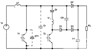 可見,該拓撲結構實現(xiàn)了主開關管T1和輸出整流二極管DF在零電壓下導通和關斷,輔助開關管T2在零電流下導通和零電壓下關斷,兩個開關管都是軟通斷,克服了普通ZVT-PWM變換器的輔助開關管為硬通斷的缺點,減少了關斷損耗。