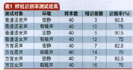 由表1可知,系統(tǒng)的識別率與語音指令詞條字數(shù)、麥克接收距離、說話人方言及環(huán)境有關(guān)。4字詞識別率高于2字詞,相對安靜環(huán)境下識別率可以達到90%以上,男聲和女聲的識別率接近。有噪聲干擾環(huán)境中識別率下降。為了提高系統(tǒng)的識別率,系統(tǒng)樣機采用奧林巴斯 ME52定向麥克(在表中沒有反映),提高了麥克接收范圍,使系統(tǒng)總體的識別率上升到95%.