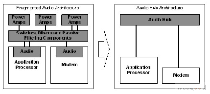 近年來(lái)發(fā)展起來(lái)的音頻中心(Hub)解決方案,通過(guò)將所有所需的音頻功能集整合到一個(gè)單芯片上,能夠方便地將高性能應(yīng)用處理器和更具成本效益的調(diào)制解調(diào)器的系統(tǒng)集成在一起。該解決方案消除了系統(tǒng)中的重復(fù),將元器件的相互依賴降到了最小程度,并為未來(lái)產(chǎn)品的研發(fā)提供了一個(gè)穩(wěn)定的平臺(tái)?! ?br />