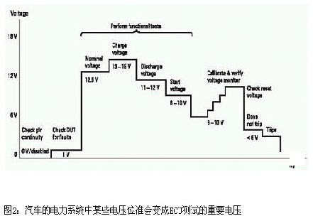 依汽車的操作狀態(tài)而定,在汽車的電力系統(tǒng)中常會碰到某些電壓位準(zhǔn)。這些位準(zhǔn)會變成ECU測試的重要電壓,如圖2所示。在這些重要電壓下執(zhí)行的一些相關(guān)測試包括: