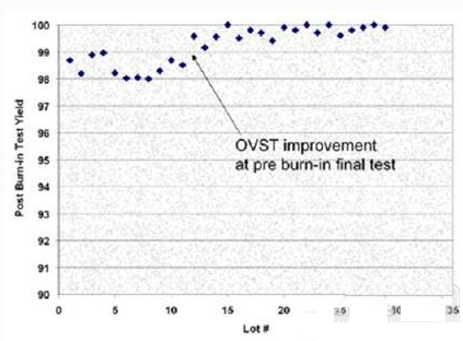 圖2超負載試驗后良率隨時間變化的情況,以及實施測試改進后良率的提高情況