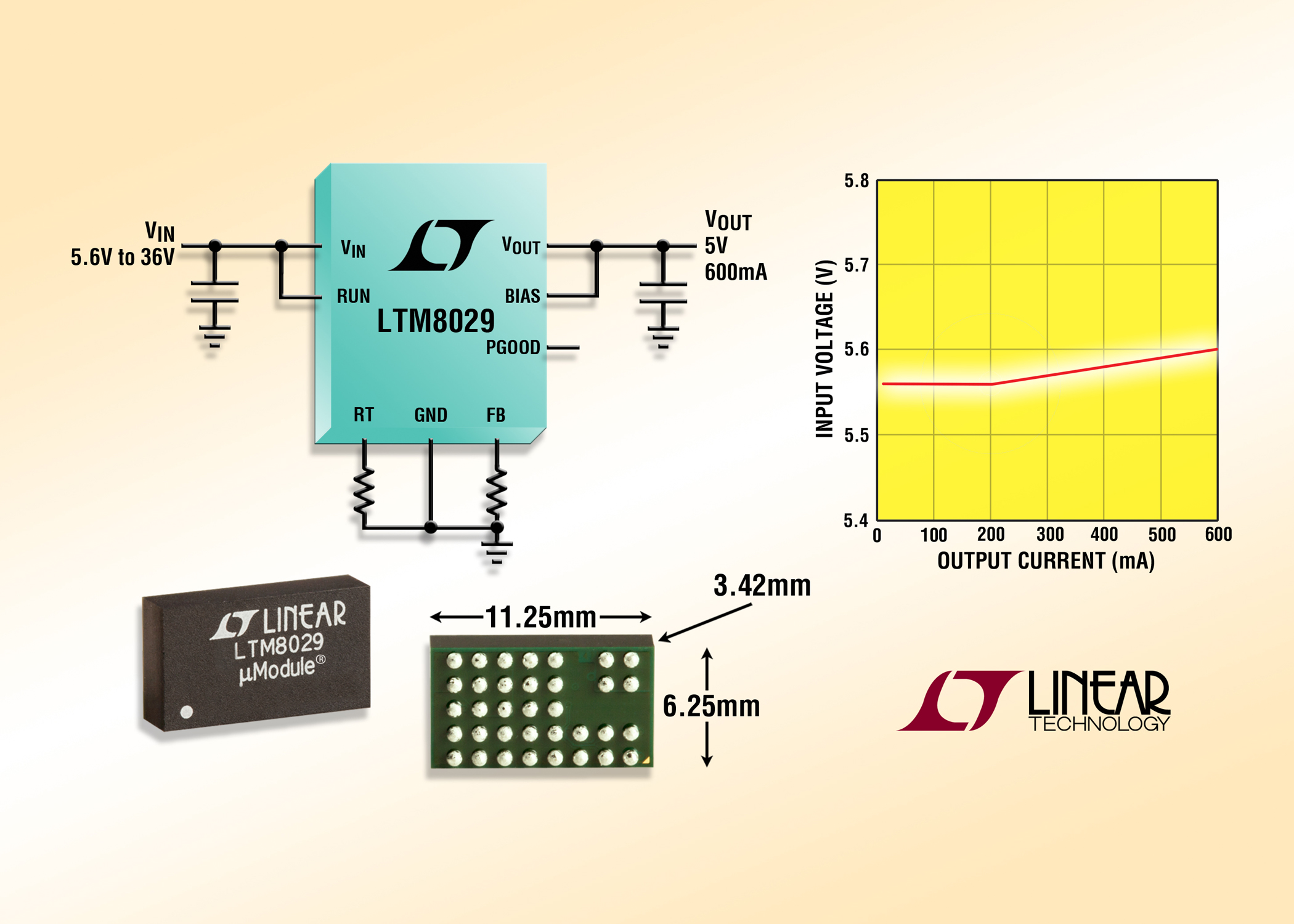 LTM8029 在小型 6.25mm x 11.25mm x 3.42mm BGA 封裝中含有電感器、電源開關(guān)、DC/DC 控制器和其他電路。從 5VIN、12VIN 和 24VIN 至 3.3VOUT/600mA 工作時(shí),效率分別為 84%、79% 和 75%。當(dāng)以 600mA 滿電流從 36VIN 轉(zhuǎn)換到 3.3VOUT 時(shí),節(jié)溫上升最小,僅為 17°C。LTM8029 具 200kHz 至 2.2MHz 的可調(diào)開關(guān)頻率,對必須保持開關(guān)噪聲在一定限度之內(nèi)的應(yīng)用是非常有用。除了正至正轉(zhuǎn)換,LTM8029 還可用來調(diào)節(jié)負(fù)輸出電壓。千片批購價(jià)為每片 6.60 美元。