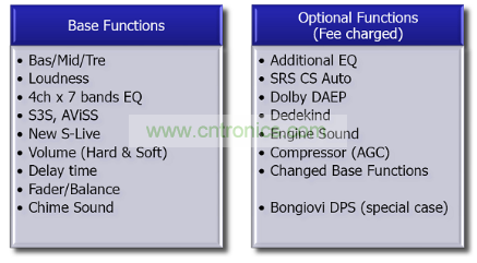左邊表中是一些基本功能,其中S3S、AViSS、New S-Live是安森美半導(dǎo)體自己的算法,可免費(fèi)提供給客戶;右邊是可供選擇的算法,需要使用授權(quán),或更改時(shí)需要研發(fā)費(fèi)用,其中包括業(yè)界知名的SRS CS Auto及Dolby DAEP算法,而Bongiovi DPS是最先進(jìn)的音效處理技術(shù)。安森美半導(dǎo)體目前是該技術(shù)唯一的IC合作伙伴。