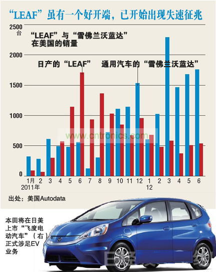 下圖為美國調(diào)查公司Autodata統(tǒng)計(jì)的、LEAF在美國市場的銷量走勢。該車于2010年12月上市,2011年銷勢良好,但進(jìn)入2012年之后銷售速度減慢,截止6月份已連續(xù)三個(gè)月低于上年同月。與競爭車型——美國通用汽車(GM)的“雪佛蘭·沃藍(lán)達(dá)”在銷量上發(fā)生了逆轉(zhuǎn)。