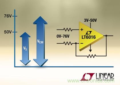 Over-the-Top 輸入提供了遠超過 V+ 軌的真正工作。LT6016 / LT6017 在輸入比V– 高出多達 76V 時仍能正常工作,而不受 V+ 是 3V 還是 50V 的影響。其他容錯功能保護運算放大器免受電源反向情況 (在 V– 高達 -50V)、負(fù)的瞬態(tài) (在 VIN 高達 -25V) 以及無供電時強制輸出電壓 (在 VOUT 高達 50V) 的影響。這種堅固的架構(gòu)對某些應(yīng)用情況尤其有用,例如放大器位于與另一電路板的模擬接口,以及對高壓側(cè)和低壓側(cè)電流檢測的應(yīng)用。