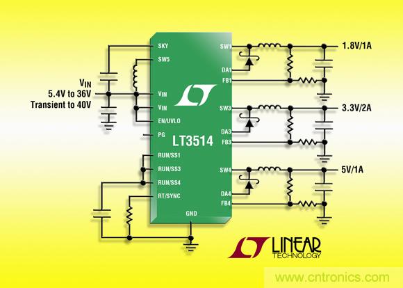 【導(dǎo)讀】凌力爾特推出具100% 占空比操作能力的 36V 輸入電壓、三通道、2A + 1A + 1A (IOUT) 降壓型開關(guān)穩(wěn)壓器LT3514。同時,它具備恒定頻率、堅固的抗短路性能等優(yōu)勢,非常適用于需要多個輸出的汽車和工業(yè)應(yīng)用。