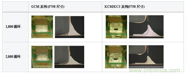 此外,KCM/KC3系列除了電路板的偏轉(zhuǎn)應(yīng)力,由于熱機(jī)械應(yīng)力,有可能達(dá)到改善焊接裂縫的產(chǎn)品。圖11中表示的是KCM/KC3系列的溫度循環(huán)后的橫截面圖片。