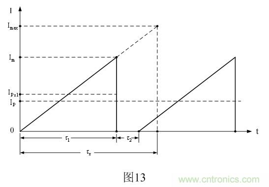 這里順便介紹一下電流平均值Ip的求法,以及其與最大電流Im和極限電流Imax的關系。圖13是電流平均值Ip與最大電流Im和極限電流Imax之間的關系圖。