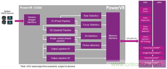 V2500 內核加入 Imagination 現(xiàn)有的 PowerVR 多媒體內核系列后,與新的 PowerVR Series6XT圖形處理器和 PowerVR Series5 視頻與靜態(tài)圖像編解碼器一起,形成了一個完整、整合的視覺平臺,能為今天的相機應用顯著節(jié)省電源與帶寬,并為臉部和姿勢識別、增強現(xiàn)實等下一代內容感知應用奠定基礎。