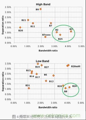 雙工器的設(shè)計根據(jù)Third Generation Partnership Project (3GPP)的規(guī)格根據(jù)頻帶的送信和收信帶寬以及送信端和收信端的頻率間隔(Separation ratio)決定了其難易度。一般來說頻率的帶寬越廣那么送信端和收信端的頻率間隔越小難易度就越高。總結(jié)兩者的關(guān)系來看,如圖4。村田制作所正致力于圖4中圈出的部分,計劃優(yōu)先實現(xiàn)TC-SAW對應(yīng)的產(chǎn)品。