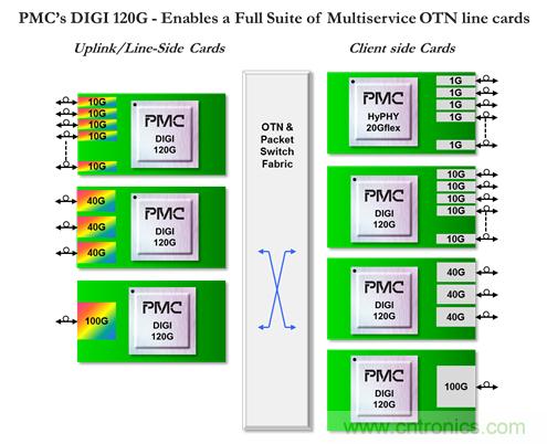 云服務(wù)和LTE帶來數(shù)據(jù)流量的持續(xù)增長,從而催生了大數(shù)據(jù)傳送的需求。電信運營商在規(guī)劃下一階段的光傳送網(wǎng)絡(luò)時,將會繼續(xù)依賴OTN交換來提供云服務(wù)所不可或缺的擴展性、網(wǎng)絡(luò)彈性、全方位的OAM以及業(yè)務(wù)的高速傳輸。為了讓運營商能夠進行高效的擴展和升級來滿足數(shù)據(jù)及網(wǎng)絡(luò)的需求,設(shè)備商必須提供創(chuàng)新性的解決方案以幫助運營商高效地利用其光網(wǎng)絡(luò)帶寬資源。而PMC的Digi 120 OTN處理器則幫助設(shè)備商在其提供給運營商的光傳輸設(shè)備里滿足所有下一代光傳送網(wǎng)所需要的功能。