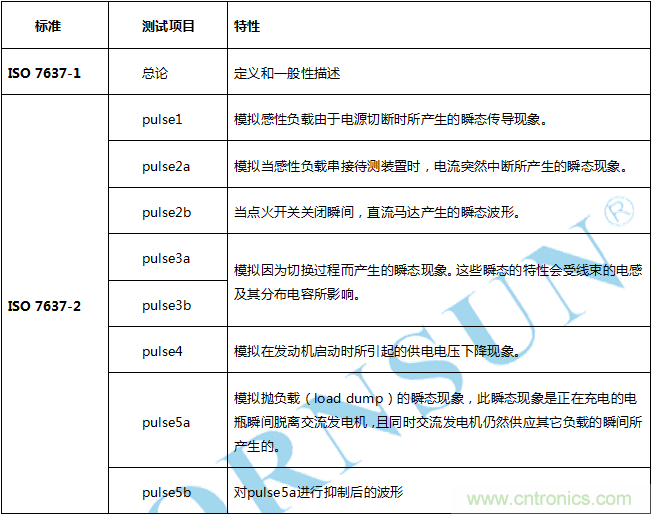 針對(duì)汽車電子自身產(chǎn)生的干擾,國(guó)際無線電干擾委員會(huì)(CISPR)對(duì)汽車電子業(yè)提出了嚴(yán)格的要求,尤其是車載收音機(jī)、數(shù)字電視、導(dǎo)航設(shè)備都是這種干擾的重災(zāi)區(qū)。所以 CISPR25:用于保護(hù)車載接收機(jī)的無線電騷擾特性的限值和測(cè)試方法,對(duì)汽車電子自身的發(fā)射狀態(tài)也有了明確的等級(jí)判定。EMS方面的測(cè)試項(xiàng)目如下所示: