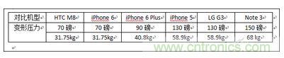 此外,美國《消費者報告》利用三點式測試方案,將iPhone 5、iPhone 6、iPhone 6 Plus、HTC M8、LG G3以及三星Note 3手機懸空固定,并對機身中間部位施加壓力,計算上述手機變彎時所能承受的壓力上限。結(jié)果顯示(見表),iPhone 6/Plus和HTC M8的承受壓力最低(圖4),在受力達31kg左右時就會被壓彎,而表現(xiàn)最好的是Note 3,在68kg壓力時“防線”才會崩潰。