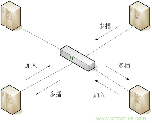 當(dāng)一臺裝置想加入某個多播組時,首先發(fā)出GMRP加入報文,交換機將接到的GMRP加入報文的端口加入該多播組,并在VLAN中廣播該GMRP加入報文,VLAN中的多播源就知道了多播成員的存在。當(dāng)組播源向組播組發(fā)送組播報文時,交換機只把該報文從先前加入到該組播組的端口轉(zhuǎn)發(fā)出去,從而實現(xiàn)VLAN內(nèi)的二次組播。如圖 1-2所示。