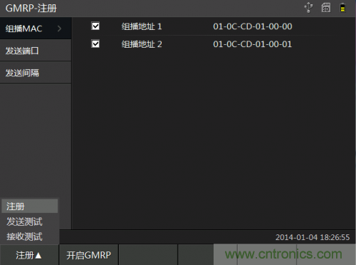 GMRP模塊在DT6000E設(shè)備總共分為注冊、發(fā)送測試和接收測試頁面。