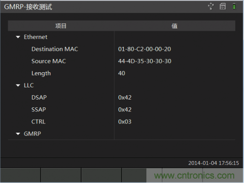接收測試頁面用于接收來自其他設(shè)備發(fā)送的GMRP報文。界面枚舉出報文類型,以及組播地址。并且對報文內(nèi)容也可以做到解析。如圖 1-4所示: