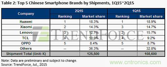 【導讀】近日,市場研究機構(gòu)TrendForce發(fā)布2015年度第二季度全球智能手機報告。中國的華為明顯獨領風騷。數(shù)據(jù)顯示,三星雖然從蘋果手里奪回第一的寶座,但是,Q1和Q2 幾乎毫無變化。蘋果的市場份額則一調(diào)再掉,從Q1的20.5%掉到Q2的15.4%。華為的市場份額增加了7%,小米的份額增加了5%。