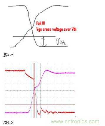 下面這種情況有非常多的人會(huì)忽視,甚至是一些比較有經(jīng)驗(yàn)的電源測(cè)試工程師。下面組圖四是下管打開(kāi),上管關(guān)閉時(shí)候的波形(圖4-1是示意圖,圖4-2示實(shí)際測(cè)試圖)。雖然沒(méi)有被同時(shí)帶起的情況,但是請(qǐng)注意上下管有交叉的現(xiàn)象,而且交叉點(diǎn)的電平遠(yuǎn)高于MOS管規(guī)定的Vth值,這是個(gè)嚴(yán)重的shoot through現(xiàn)象。最直接的后果就是MOS管燒毀!