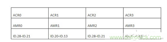 如上表所示,ACR寄存器是接收代碼寄存器,AMR是接收屏蔽寄存器。ACR一般是需要與對應(yīng)的ID相吻合的,但是如果AMR的相應(yīng)位上設(shè)置為1的時候,ID的那一位數(shù)據(jù)可以不和AMR的相應(yīng)位一樣,也就是起到屏蔽的作用。