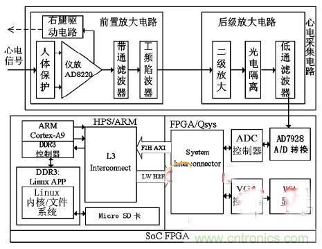 【導(dǎo)讀】本設(shè)計(jì)實(shí)現(xiàn)了一種基于片上系統(tǒng)現(xiàn)場(chǎng)可編程門陣列(SoC FPGA) 的心電信號(hào)(ECG)檢測(cè)系統(tǒng)。系統(tǒng)通過具有高輸入阻抗、高共模抑制比和低噪聲的前置采集放大電路,實(shí)現(xiàn)心電信號(hào)的拾取和預(yù)處理。