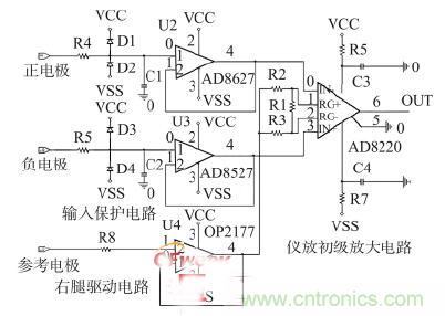 前置放大電路由前級(jí)放大電路、帶通濾波電路和50 Hz工頻陷波電路組成,其中,前級(jí)放大電路又包括輸入保護(hù)電路、右腿驅(qū)動(dòng)電路和儀表運(yùn)放放大電路組成,如圖2 所示。