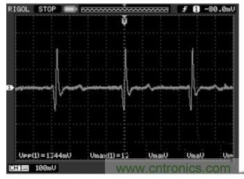 受測(cè)者佩戴心電電極,用醫(yī)用導(dǎo)聯(lián)線接入到模擬前端采集電路,后端接入示波器,待信號(hào)穩(wěn)定后就可以在示波器上觀測(cè)到心電信號(hào)波形,圖5 即為模擬前端電路實(shí)際測(cè)試波形圖。