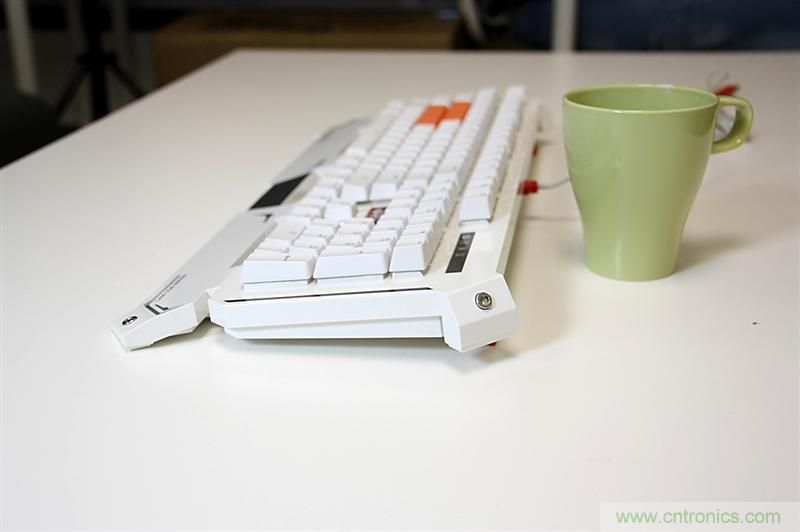 雖然B740鍵盤是傾斜式設(shè)計(jì),但為了滿足更多樣化的玩家,鍵盤背面上部還是加有增高腳架,并且在腳架底部包有紅色膠套,有防滑、降低震動(dòng)的效果。