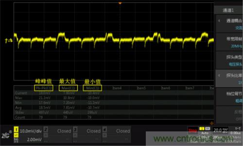 紋波測試一般以峰峰值來表示,具體可以使用【measure】進(jìn)行自動測量,如下截圖ZDS2000系列示波器,能支持51種真正意義的參數(shù)測量統(tǒng)計(jì)功能,基于全存儲深度的基礎(chǔ)上測量紋波的參數(shù),或者也可以使用“一鍵光標(biāo)”進(jìn)行手動測量,如下圖6所示。