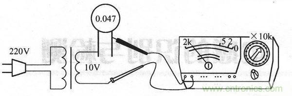 (2)容量小于0.01 pF的固定電容的檢測 檢測10pF以下的小電容時,因電容容量太小,故用萬用表進行測量,只能檢查其是否有漏電、內部短路或擊穿現象:測量時選用萬用表R×10k擋,將兩表筆分別任意接電容的兩個引腳,阻值應為無窮大。如果測出阻值為零,則可以判定該電容漏電損壞或內部擊穿。