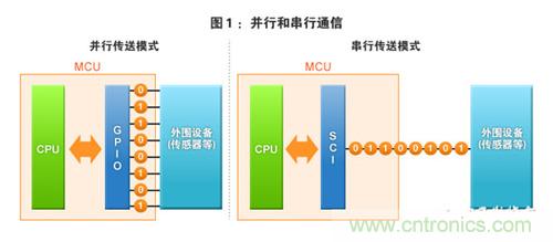 單片機(jī)是嵌入式設(shè)備的“頭腦”,其與作為嵌入式設(shè)備的“手和腳”是各種外圍設(shè)備(輸入輸出設(shè)備等)連接。單片機(jī)應(yīng)該怎樣與這些外圍設(shè)備連接才好呢?比如,我們來(lái)考慮一下將傳感器與單片機(jī)連接的情況。如果使用本連載第1期中介紹的“GPIO”的話,從傳感器向單片機(jī)傳送8位信號(hào)時(shí)需要使用8個(gè)引腳。這種傳送模式被稱為并行(并行通信)模式(圖1―左)。但是,僅一個(gè)傳感器就需要連接8個(gè)引腳,確實(shí)太可惜了,是否還有連接更少的引腳就能達(dá)到同樣目的的方法呢?