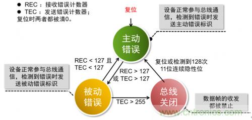 為了避免某個設(shè)備因為自身原因(例如硬件損壞)導(dǎo)致無法正常收發(fā)數(shù)據(jù)而不斷地破壞數(shù)據(jù)幀,從而影響其他正常節(jié)點通訊,CAN-bus規(guī)范中規(guī)定每個CAN控制器都有一個發(fā)送錯誤計數(shù)器和一個接收計數(shù)器。根據(jù)計數(shù)值不同CAN節(jié)點會處于不同的設(shè)備狀態(tài),狀態(tài)之間的轉(zhuǎn)換關(guān)系見下圖: