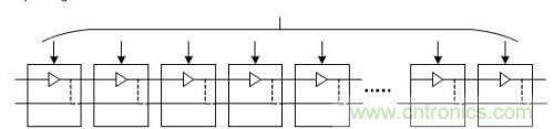 圖 1給出一個預(yù)定數(shù)量的延遲單元構(gòu)成的延遲線電路和通過配置字實現(xiàn)的反饋通道(Dfb)的示例,通過延遲配置字,可以在Din引腳輸入信號和Dout引腳輸出信號之間設(shè)定所需 延時。每個延遲單元在Din和Dl兩個引腳之間生成固定的通道延時。