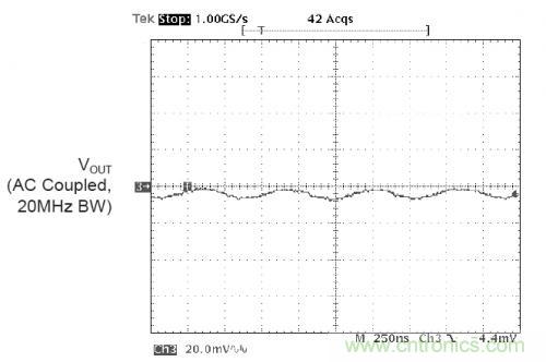 下圖是采用20MHz帶寬限制測(cè)試到的電源的紋波以及噪聲。示波器20MHz的帶寬限制是為了防止無(wú)源探頭帶入的共模噪聲??梢钥吹紸AT1121BUCK轉(zhuǎn)換器的紋波噪聲為10mVp-p,幾乎看不到開(kāi)關(guān)噪聲。這主要是歸功于BUCK控制器的低噪聲設(shè)計(jì),良好的PCB設(shè)計(jì),以及恰當(dāng)?shù)臏y(cè)試方法。