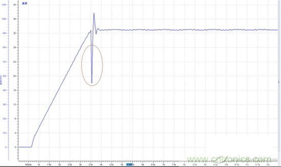 某使用PWM波形驅動的直流電機在加速過程中存在微小抖動情況,觀察電機轉速波形如圖3所示,開始加速后大約在3.6秒轉速出現(xiàn)一個下拉動作。電機PWM調(diào)速原理是通過改變接通脈沖的寬度,使直流電機電樞上電壓的占空比改變,從而改變電樞電壓的平均值,控制電機的轉速。因此基本可以確定這個轉速下拉動作是由于PWM波占空比出現(xiàn)異常引起的。