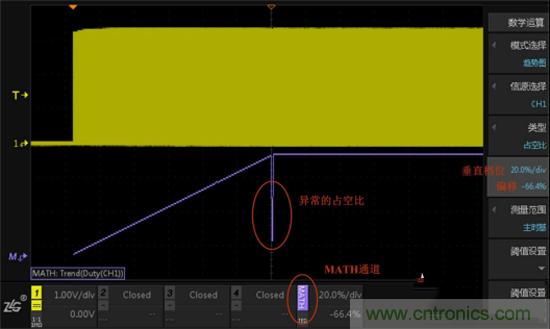 這個時候用ZDS4000系列示波器新開發(fā)獨特的占空比趨勢測量功能,將每一個PWM波的占空比顯示在屏幕上,點擊示波器數(shù)學運算Math按鍵,模式選擇趨勢圖,類型選擇占空比,示波器會自動檢測PWM波的周期和閾值,無需過多設置,就可以快速出波形,波形如圖5所示。屏幕上除了通道1,還多了MATH通道,顏色為紫色,MATH通道顯示的即是占空比趨勢,可以看到占空比緩慢遞增后大約在屏幕中間位置出現(xiàn)了異常。和通道1一樣,MATH通道也可以調(diào)節(jié)垂直檔位和偏移。