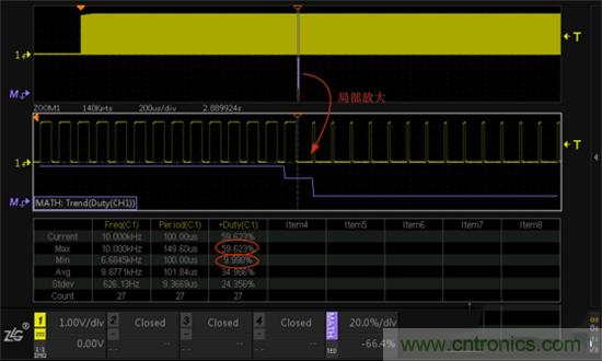定位到占空比異常位置后,開啟示波器縮放模式下ZOOM多窗口顯示功能,對信號進行局部放大,如圖6所示,可以清晰的看到占空比異常的細節(jié),同時開啟對ZOOM1窗口數(shù)據(jù)的測量和統(tǒng)計,可以看到占空比從正常的59.62%變?yōu)?.99%左右。