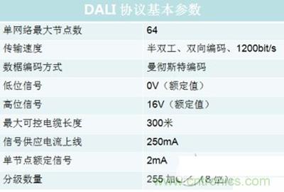 DALI數(shù)字式可尋址燈光接口(Digital Addressable LighTIng Interface)鎮(zhèn)流器是當前最新的可調(diào)光熒光燈鎮(zhèn)流器。DALI是一個數(shù)據(jù)傳輸?shù)膮f(xié)議,它定義了電子鎮(zhèn)流器與設(shè)備控制器之間的通信方式,基于DALI 協(xié)議組建的系統(tǒng)具有分布式智能模塊, 各個智能化DALI 模塊都具有數(shù)字控制和數(shù)字通信能力, 地址和燈光場景信息等都存儲于各個DALI 模塊的存儲器內(nèi)。DALI 模塊通過DALI 總線進行數(shù)字通信、傳遞指令和狀態(tài)信息,實現(xiàn)燈的開關(guān)、調(diào)光控制、系統(tǒng)的設(shè)置等功能。DALI總線制定一個系統(tǒng)結(jié)構(gòu)簡單、安裝方便、操作容易、功能良優(yōu)的燈光控制系統(tǒng),可用于一個房間內(nèi)的燈光控制,還可以連接更高級的設(shè)備網(wǎng)絡(luò),如以太網(wǎng),以支持更多的設(shè)備和足夠的網(wǎng)絡(luò)帶寬。 DALI協(xié)議的基本參數(shù)如下: