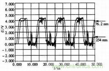 在高速數(shù)字電路的設(shè)計中,除了阻抗匹配外,部分器件對傳輸線的長度有著嚴(yán)格的要求,信號頻率越高,要求傳輸線的長度越短。以X1器件和X2器件為例建立仿真模型如圖3所示。在仿真模型中加了33Ω的匹配電阻,選擇仿真信號頻率為66MHz方波,改變傳輸線長度分別為76.2mm和254mm時進(jìn)行仿真。仿真結(jié)果如圖4所示。