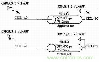 由于頻率的提高,傳輸線之間的串?dāng)_明顯增大,對信號完整性也有很大的影響,可以通過仿真來預(yù)測、模擬,并采取措施加以改善。以CMOS信號為例建立仿真模型,如圖6所示。在仿真時設(shè)置干擾信號的頻率為66MHz的方波,被干擾者設(shè)置為零電平輸入,通過調(diào)整兩根線的間距和兩線之間平行走線的長度來觀察被干擾者接收端的波形。仿真結(jié)果如圖7,分別為間距是203.2mm、406。4mm時的波形。