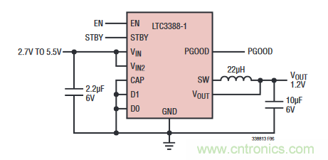 圖 1:簡便的 LTC3388-1 典型低壓應(yīng)用電路