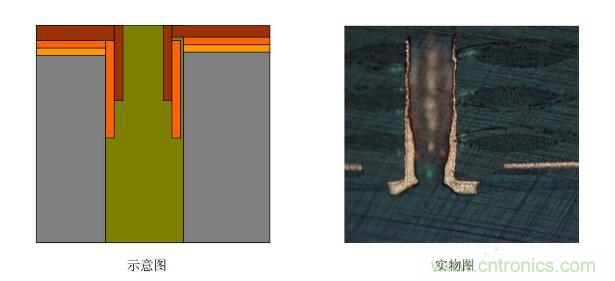 4. 塞孔無銅:圖電蝕刻后,有明顯的物質(zhì)卡塞在孔中,大部分孔壁被蝕掉,斷口處圖電層未將板電層包住。