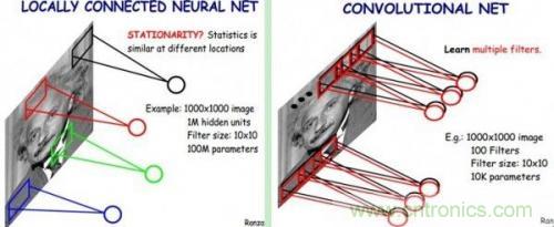 CNN中認(rèn)為同一層中的權(quán)重參數(shù)可以共享,因?yàn)橥粡垐D片的各個(gè)不同區(qū)域具有一定的相似性。這樣原本的全連接計(jì)算量過(guò)大問(wèn)題就解決了,如下圖所示:
