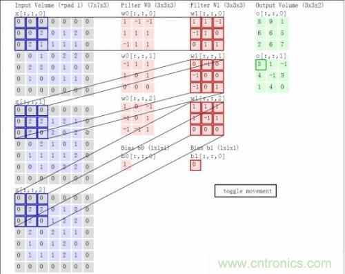 這里卷積核大小與移動(dòng)的步長(zhǎng)stride、輸出深度決定了下一層網(wǎng)絡(luò)的大小。同時(shí),核大小與stride步長(zhǎng)在導(dǎo)致上一層矩陣不夠大時(shí),需要用padding來(lái)補(bǔ)0(如上圖灰色的0)。以上就叫做卷積運(yùn)算,這樣的一層神經(jīng)元稱為卷積層。上圖中W0和W1表示深度為2。