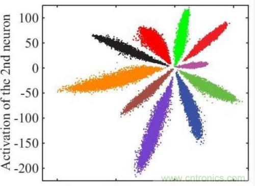 以上只是通用的CNN網(wǎng)絡(luò),由于人臉識(shí)別應(yīng)用中不是直接分類,而是有一個(gè)注冊(cè)階段,需要把照片的特征值取出來(lái)。如果直接拿softmax分類前的數(shù)據(jù)作為特征值效果很不好,例如下圖是直接將全連接層的輸出轉(zhuǎn)化為二維向量,在二維平面上通過(guò)顏色表示分類的可視化表示: