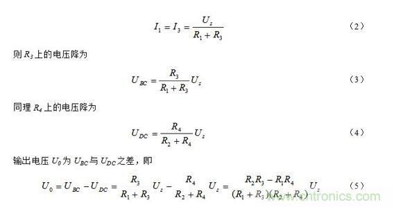 在用非平衡電橋測(cè)電阻時(shí),需將被測(cè)電阻Rx作為橋臂R4接入非平衡電橋,并進(jìn)行預(yù)調(diào)平衡,這時(shí)電橋輸出電壓為0。改變外界條件(如溫度t),則被測(cè)電阻發(fā)生變化,這時(shí)電橋輸出電壓U0≠0,開(kāi)始作相應(yīng)變化。測(cè)出這個(gè)電壓U0后,可根據(jù)(7)~(9)式計(jì)算得到△R,從而求得Rx=R4+△R。