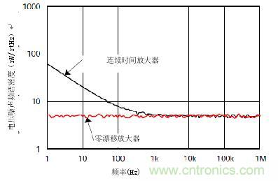 圖5顯示了零漂移(紅色)和連續(xù)時(shí)間(黑色)放大器的1/f和寬帶電壓噪聲頻譜密度。注意零漂移曲線沒有1/f電壓噪聲。